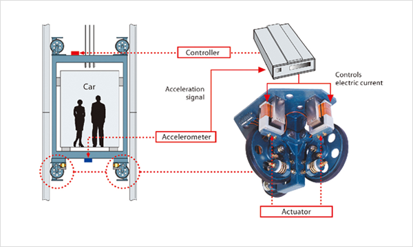 고속으로 운행하는 엘리베이터에서는 횡진동이 크게 발생합니다. 미쓰비시는 세계 최초로 혁신적인 액티브 롤러 가이드 기술을 적용하여 이 진동을 약 50% 감소시켰습니다. 액티브 롤러 가이드 기술은 제어된 전자력에 의해서 진동을 억제하는 액츄에이터(Actuators)와 운전 중에 카의 진동을 검출하는 가속도계를 경유하여 동작합니다. 미쓰비시의 액티브 롤러 가이드를 사용하는 승강기에서는 기존의 롤러 가이드를 사용하고 있는 승강기에서보다 더 쾌적한 승차감을 느끼실 수 있습니다.
