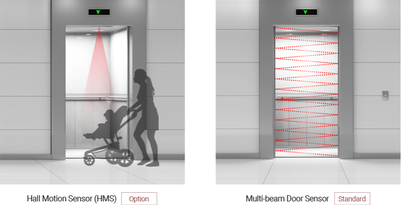 미쓰비시의 신뢰성 높은 안전장치는 도어의 열림 닫힘 시 접근하는 승객이나 물체를 명확하게 감지합니다. 센서의 종류에 따라 검출 영역은 상이할 수 있습니다.