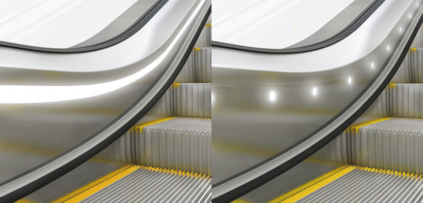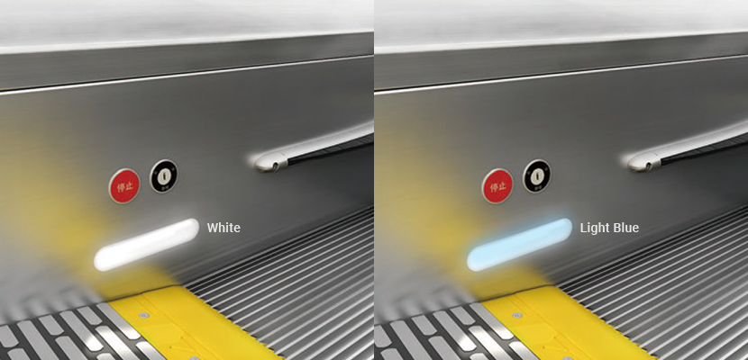 K-Series 에스컬레이터는 핸드레일, 스커트, 콤, 스텝 하부 등 모든 시스템에 LED 조명을 채택하였습니다.